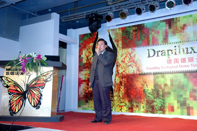 陈辉:顾德蓉女士的德文讲得很好,没听懂。但是翻译翻得很好,徐小姐翻得很好,尊敬的长秘书长,顾德蓉女士和各位媒体的朋友,各位来宾,很高兴大家来到drapilux生态布艺的发布会现场,感谢各位的到来,今天发布会的主题和生态有关,说到生态,近几年我国建筑装饰的关于环保方面的投诉率居高不下,成为行业发展的阻碍。其中投诉最多的还是健康方面出现的事故,消费者的消费理念,从传统的单纯追求实用美观,发展到追求绿色生态,来营造健康的居室环境,这为正处于转型期的中国建筑装饰行业指明了发展方向。我觉得在世界内,生态家居是必然的发展趋势。今天,主要向大家介绍的是德国drapilux生态布艺系列,这种产品是通过布艺分别室内甲醛,尼古丁等有害污染,这是一项突破性的尖端技术,我们想把它引入中国,就是想让更多的消费者能够想它带来的健康,关于它的具体功能,刚才我们的德国专家已经做了讲解。